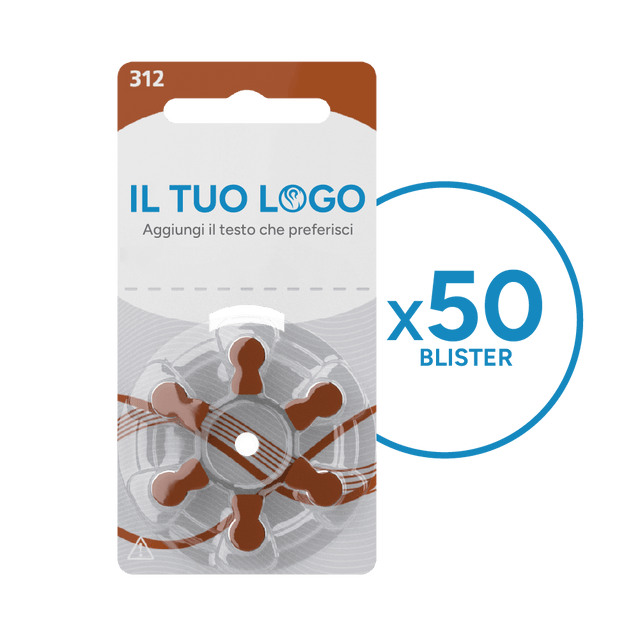 Batterie 312 per Apparecchi Acustici (colore marrone) con il logo del tuo centro acustico stampato sulla confezione. Personalizza il blister per rafforzare il tuo brand, fidelizzare i clienti e distinguerti dalla concorrenza.