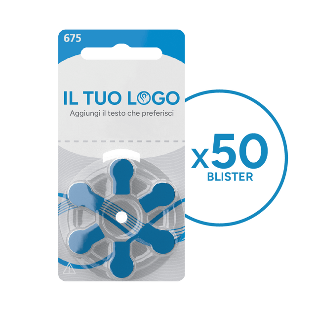 Batterie 675 per Apparecchi Acustici (colore blu) con il logo del tuo centro stampato sulla confezione. Personalizza il blister per rafforzare il tuo brand, fidelizzare i clienti e distinguerti dalla concorrenza.