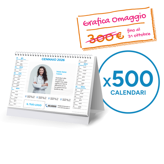 Un vero strumento di comunicazione costruito su misura per il tuo centro audioprotesico, non è un semplice calendario con il tuo logo. Ogni pagina può essere personalizzata nei contenuti, dalle immagini ai messaggi, rendendolo unico e perfettamente in linea con la tua realtà.